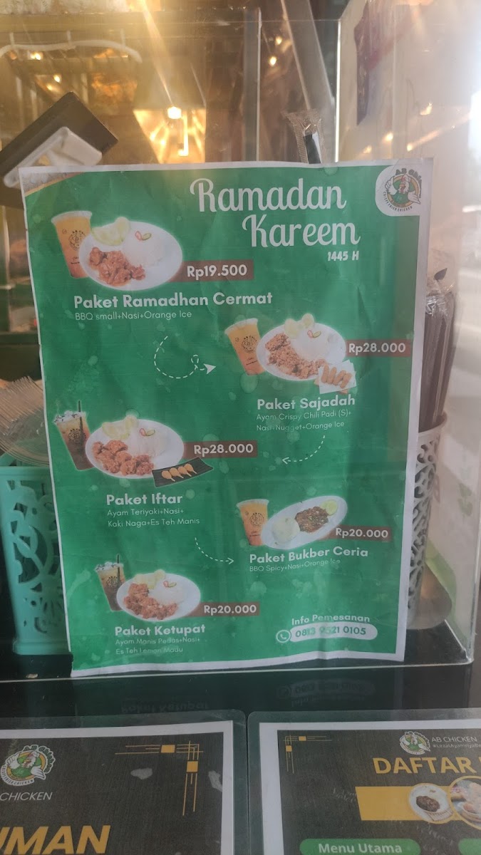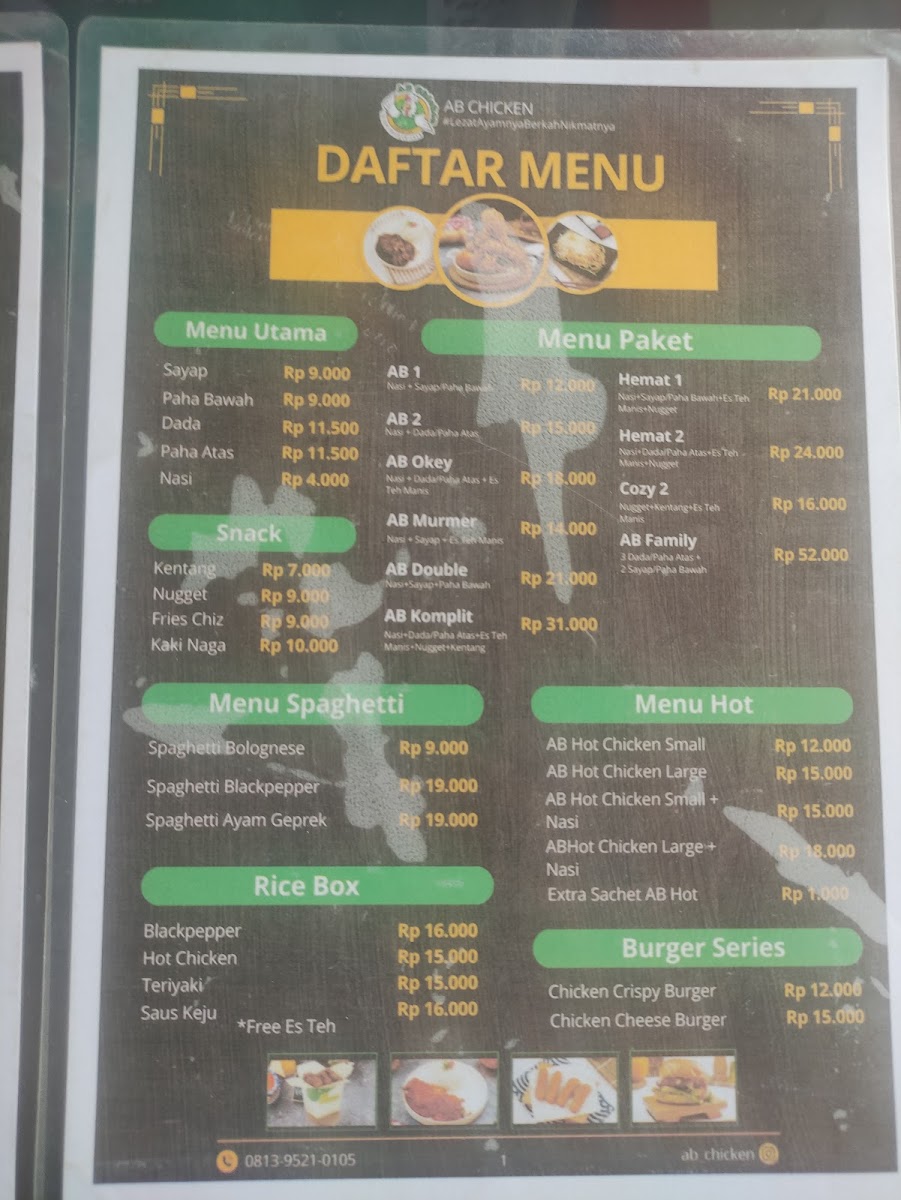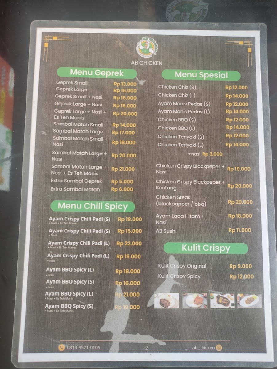 Introducing the menu at AB Chicken Cigasong, a delightful culinary gem located in the heart of Cigasong, Jawa Barat. This restaurant offers a rich array of dishes that reflect a blend of local flavors and culinary creativity. Guests rave about the succulent chicken and perfectly cooked rice, served alongside a selection of tantalizing sauces, most notably the spicy sambal geprek, which has garnered a dedicated following.